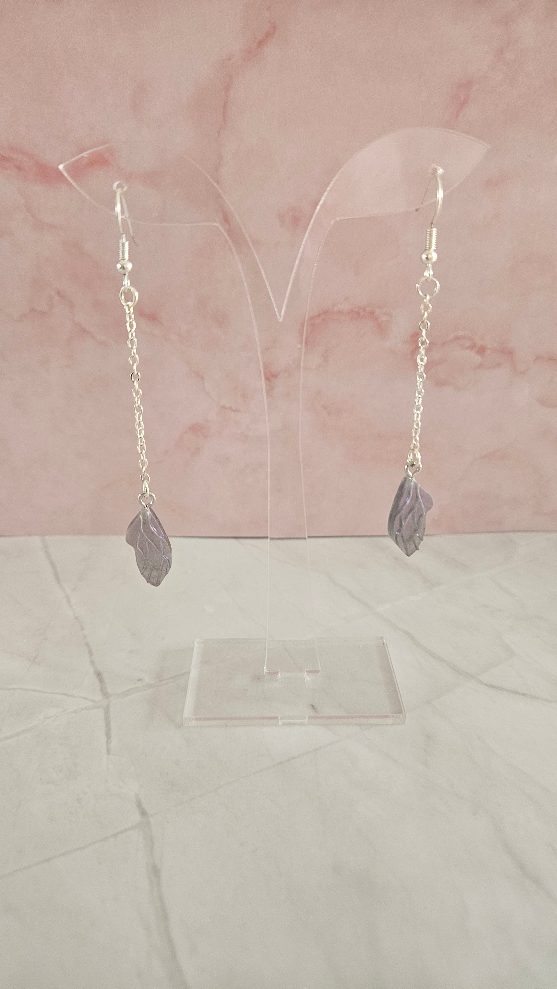 Boucle d'oreille en forme d'ail de fée de petite taille. Violette et noire avec une petite chaîne.