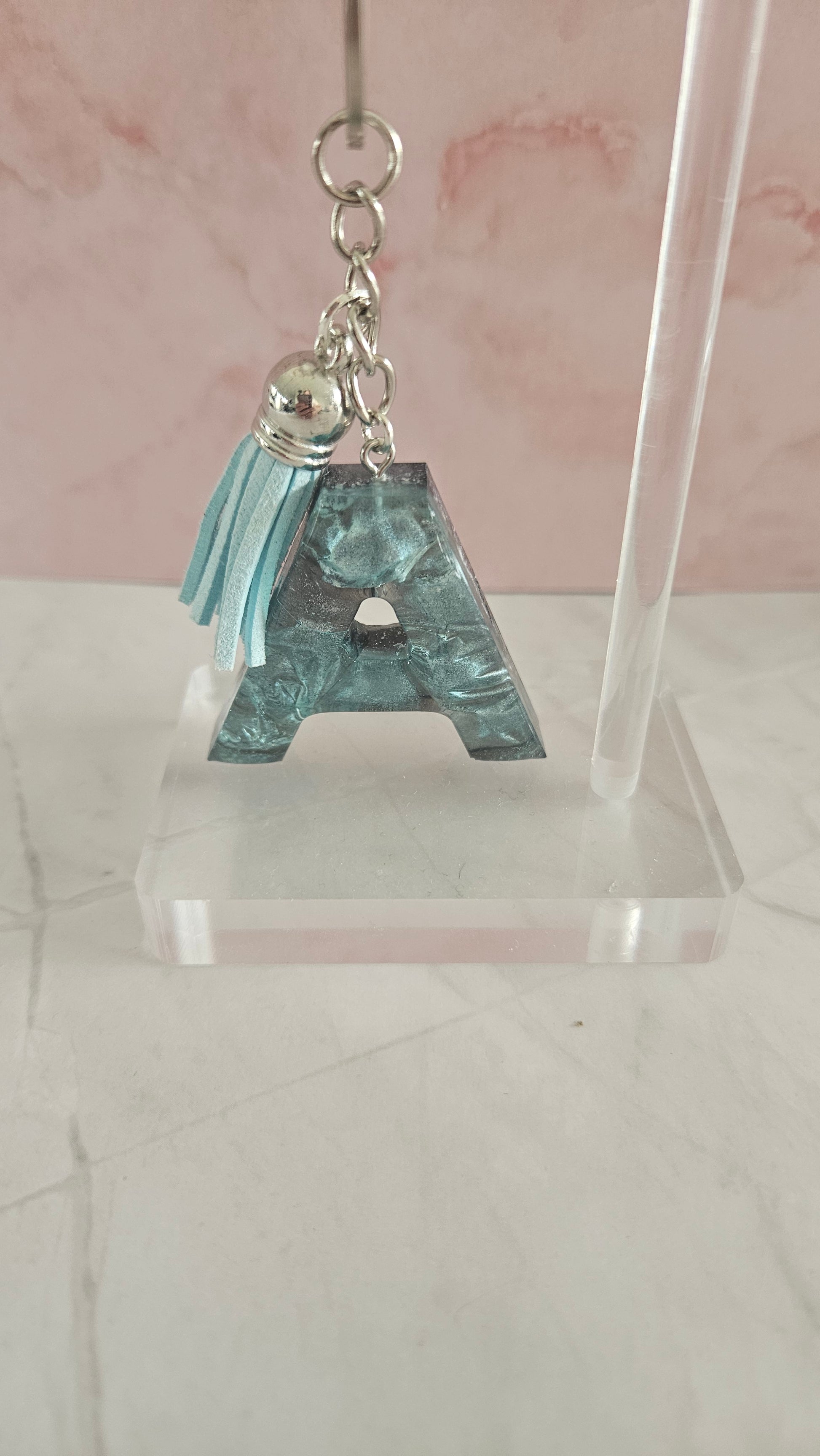 Porte clé lettre A, de couleur noir et turquoise avec un pompon bleu