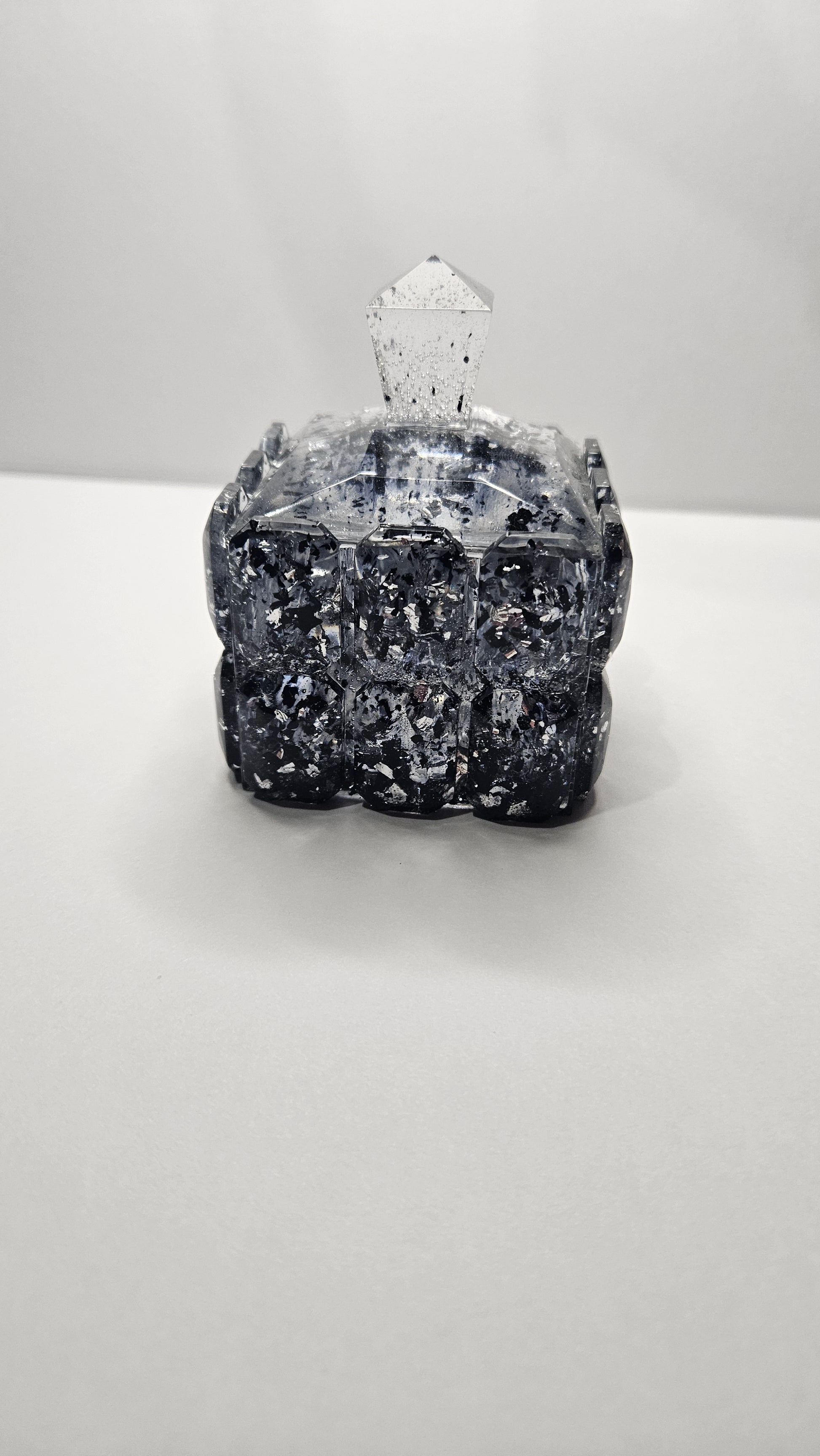 Boîte cube avec des feuille noir et argenté.