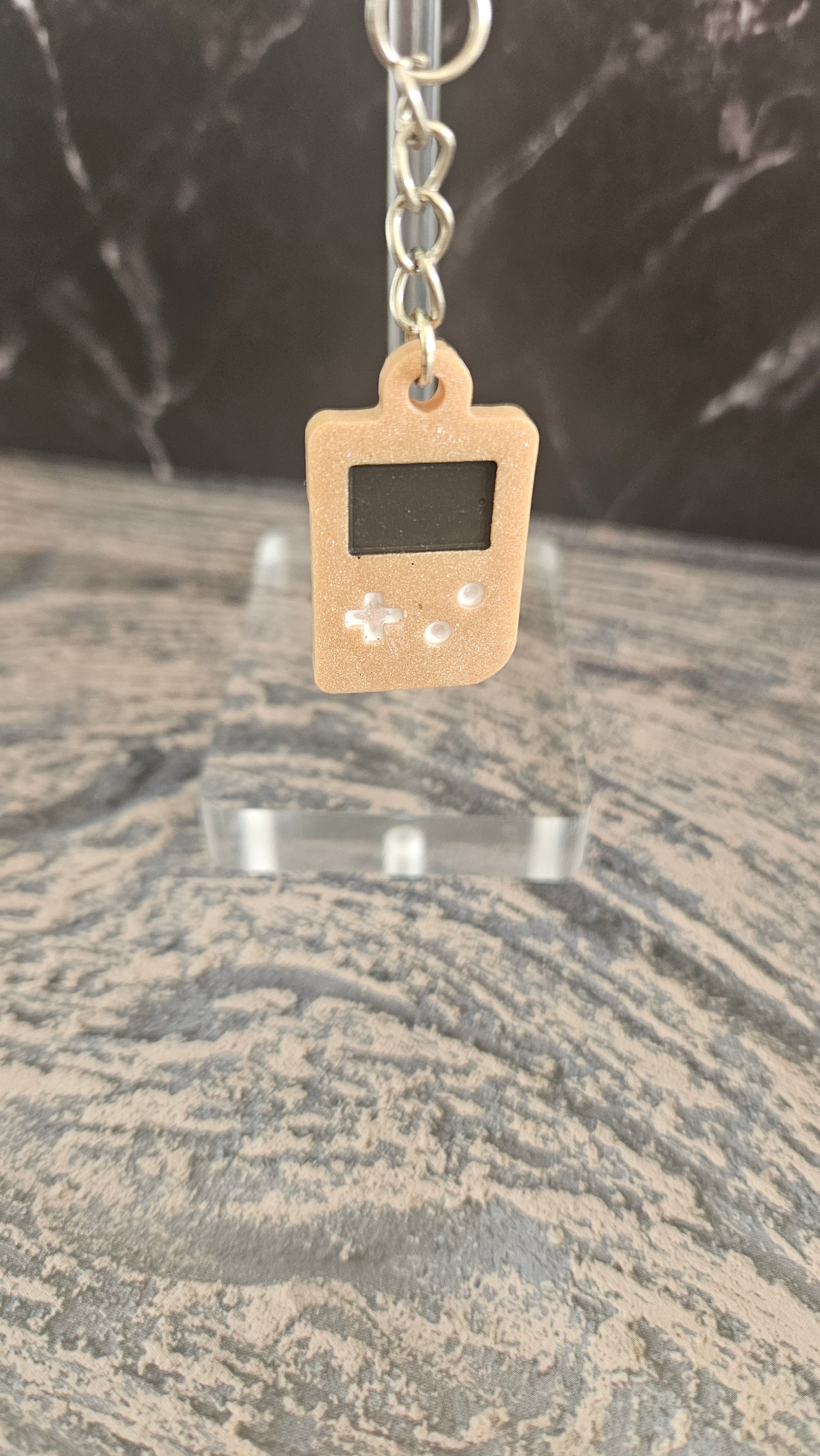 Porte clé en forme de cameboy beige avec un écran noir et les touches blanches.