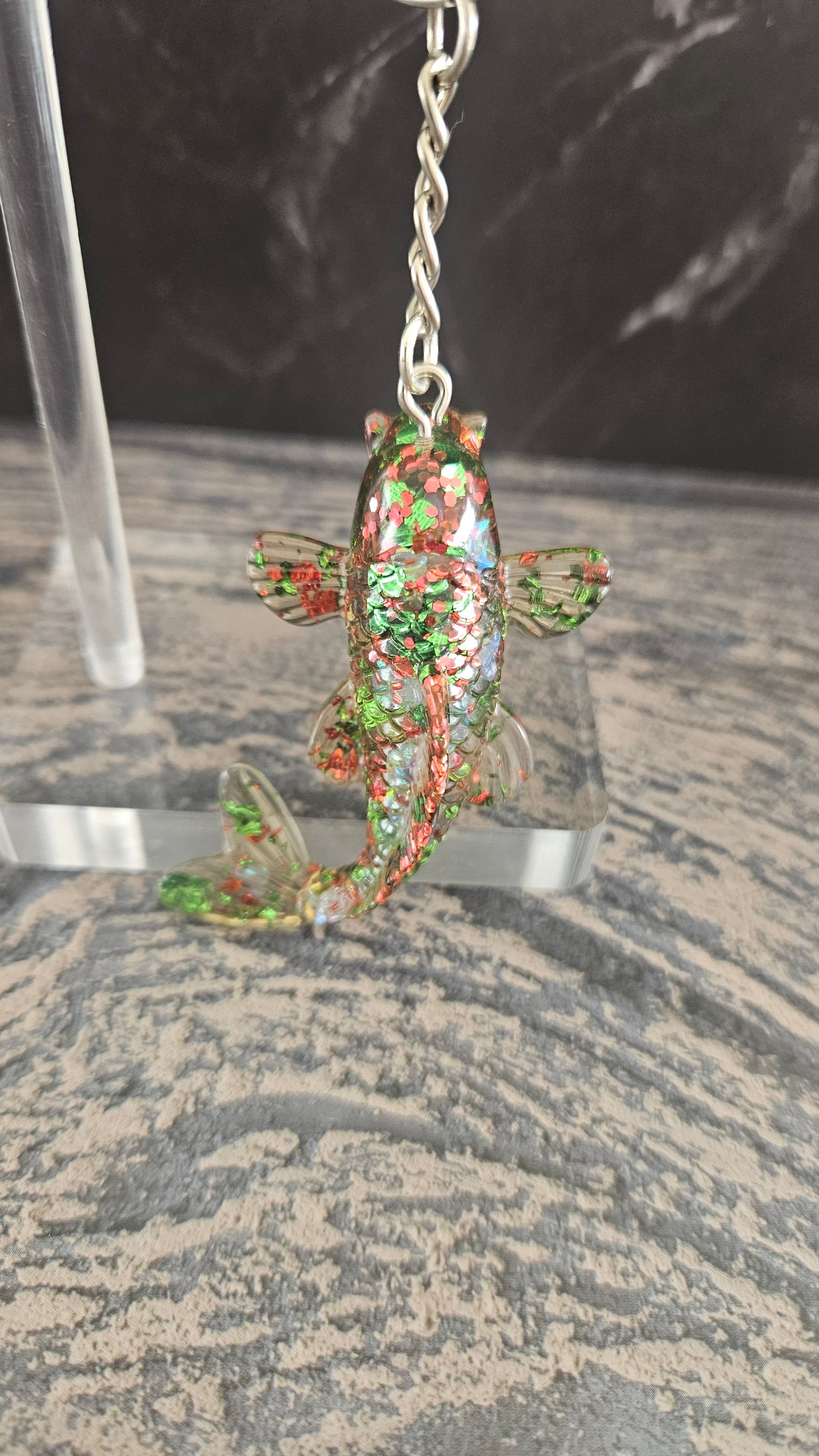 Porte clé carpe noël. Paillettes rouge blanche verte.