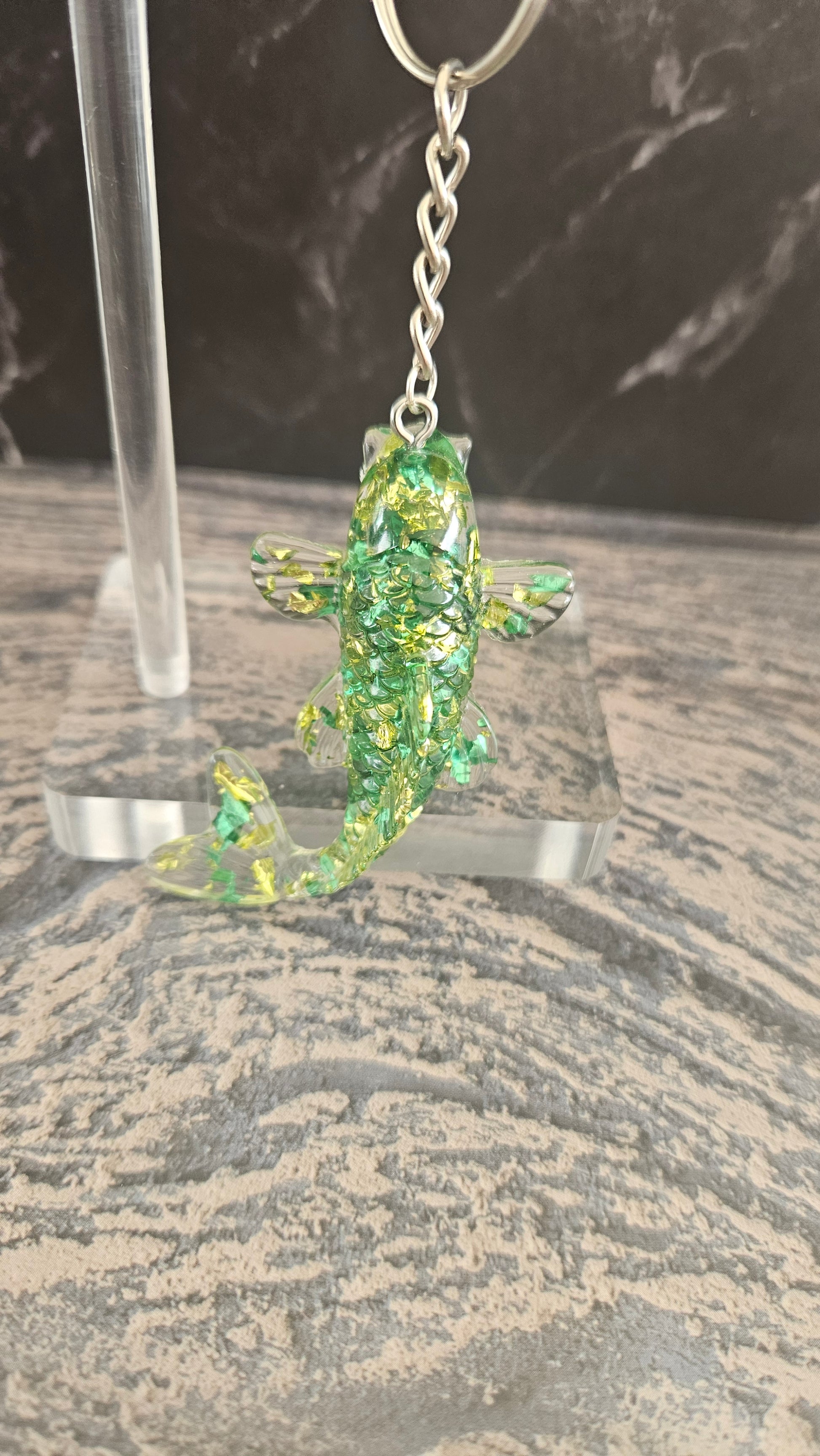 Porte clé carpe avec des feuilles d'or et verte.