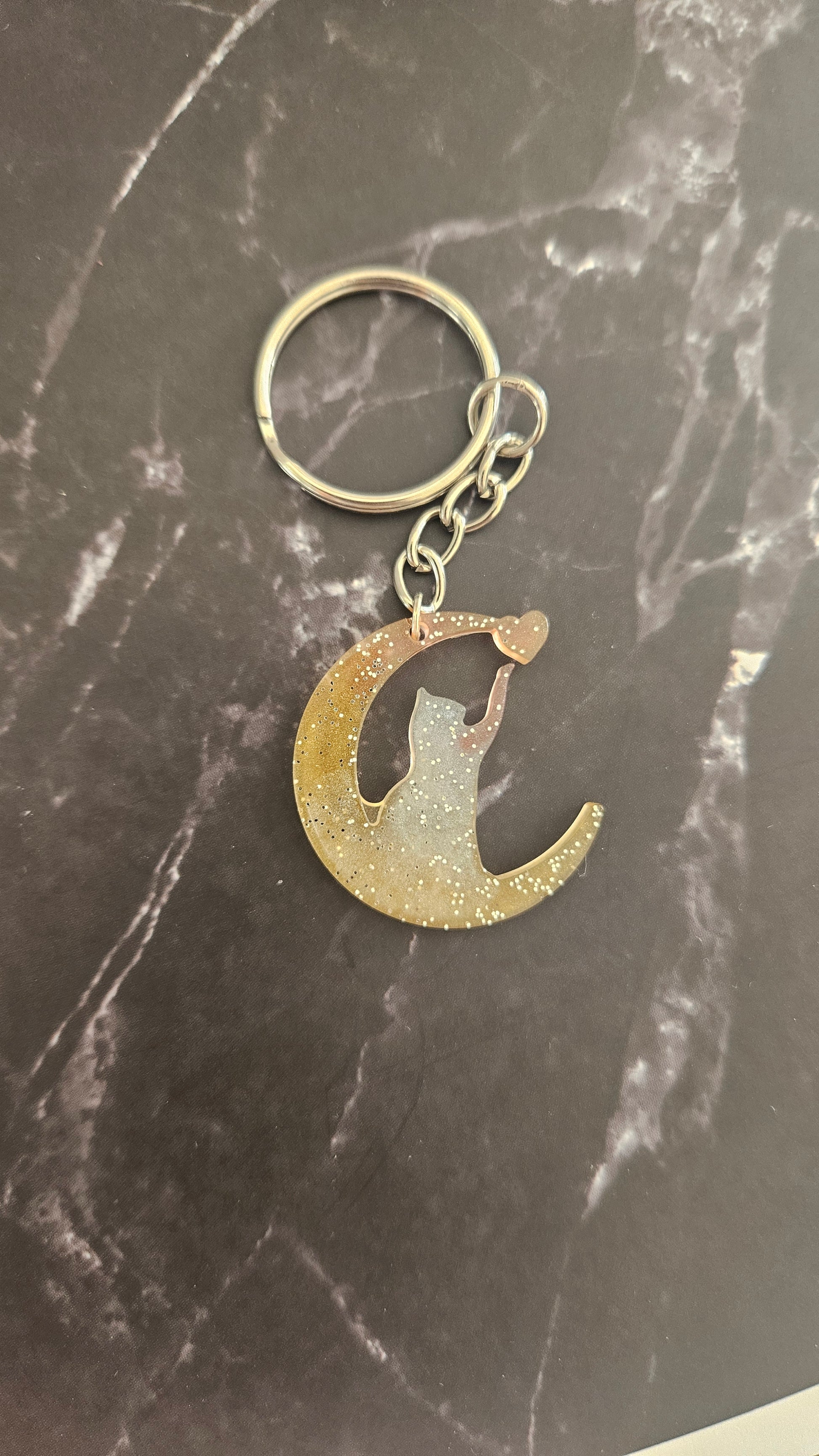 Porte clé chat sur lune avec un cœur. De couleur jaune, blanc, rouge avec des paillettes.