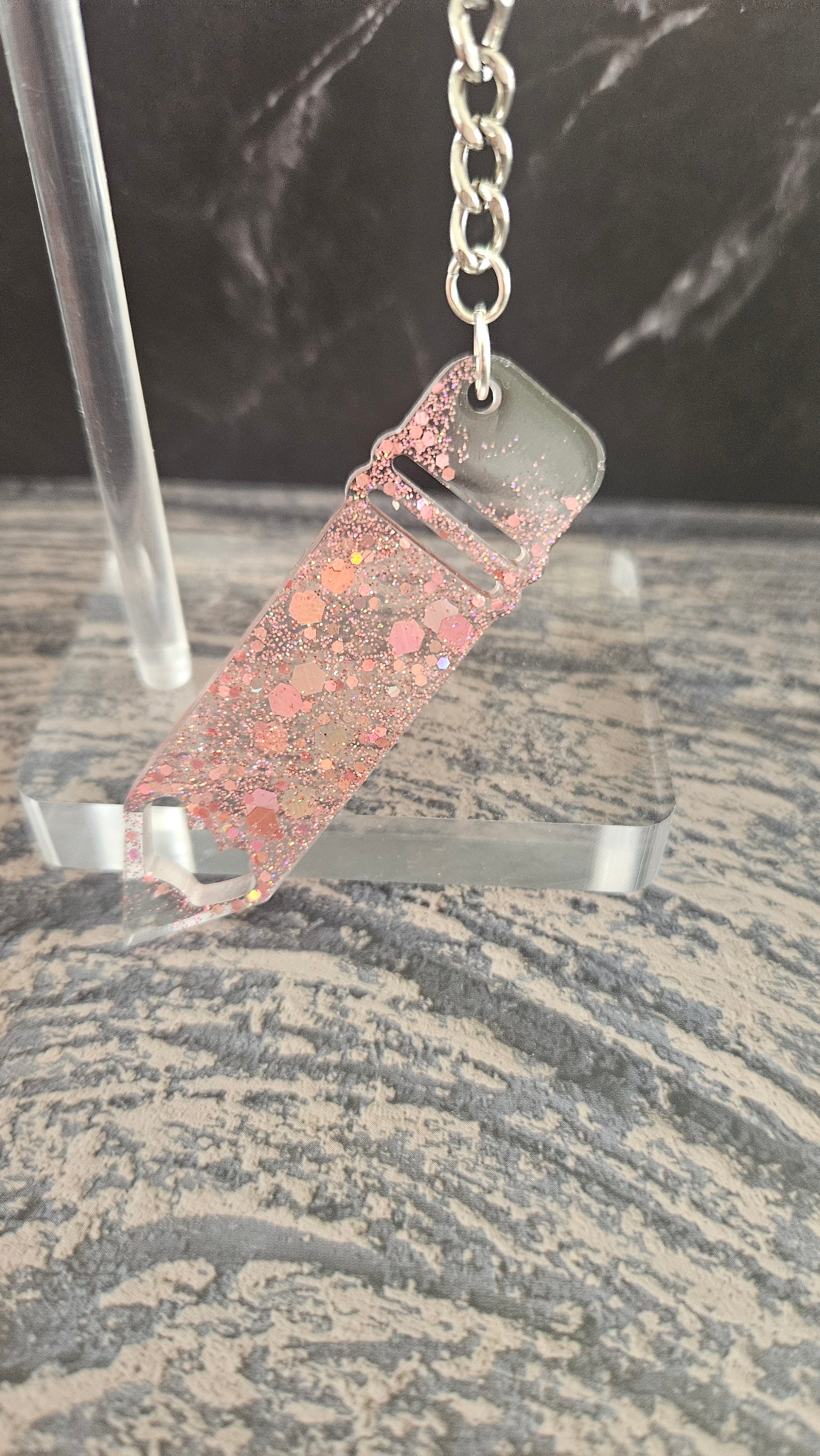 Porte clé crayon transparent avec des grosse et petite paillettes rose.