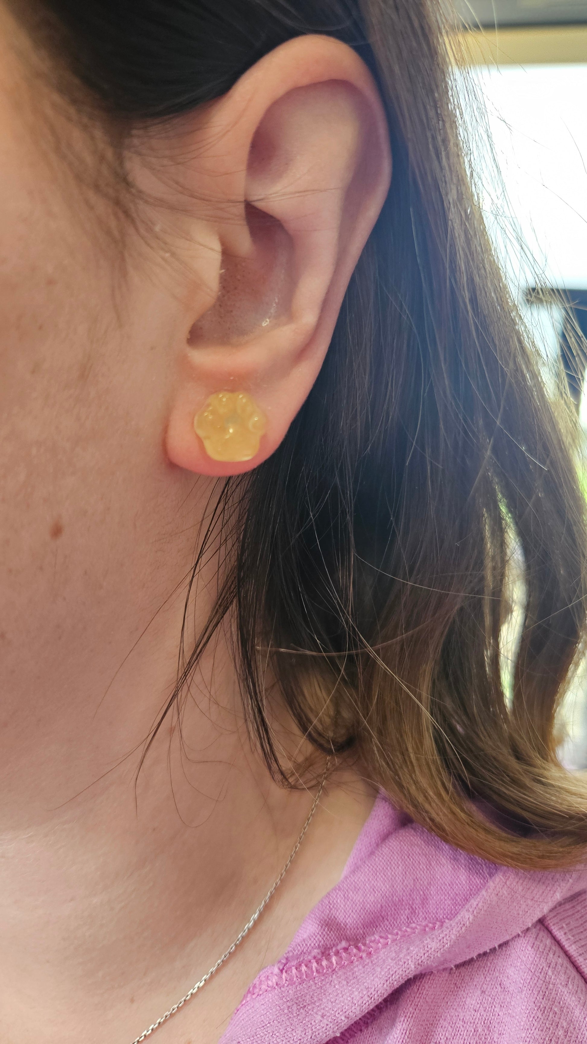 Boucle d'oreille en forme de mini patte de couleur jaune beige.