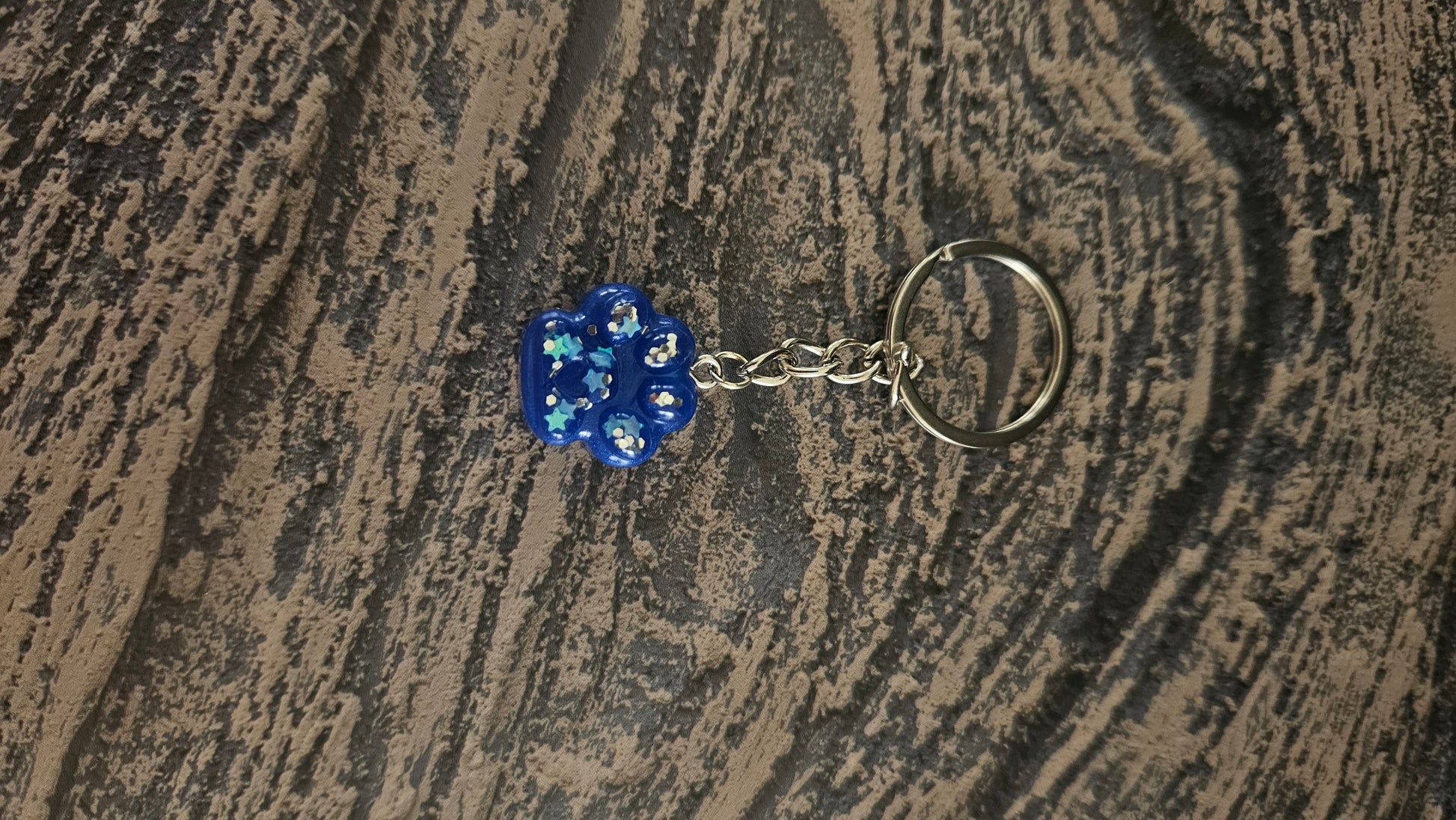 Porte clé patte bleu foncé avec des paillettes.