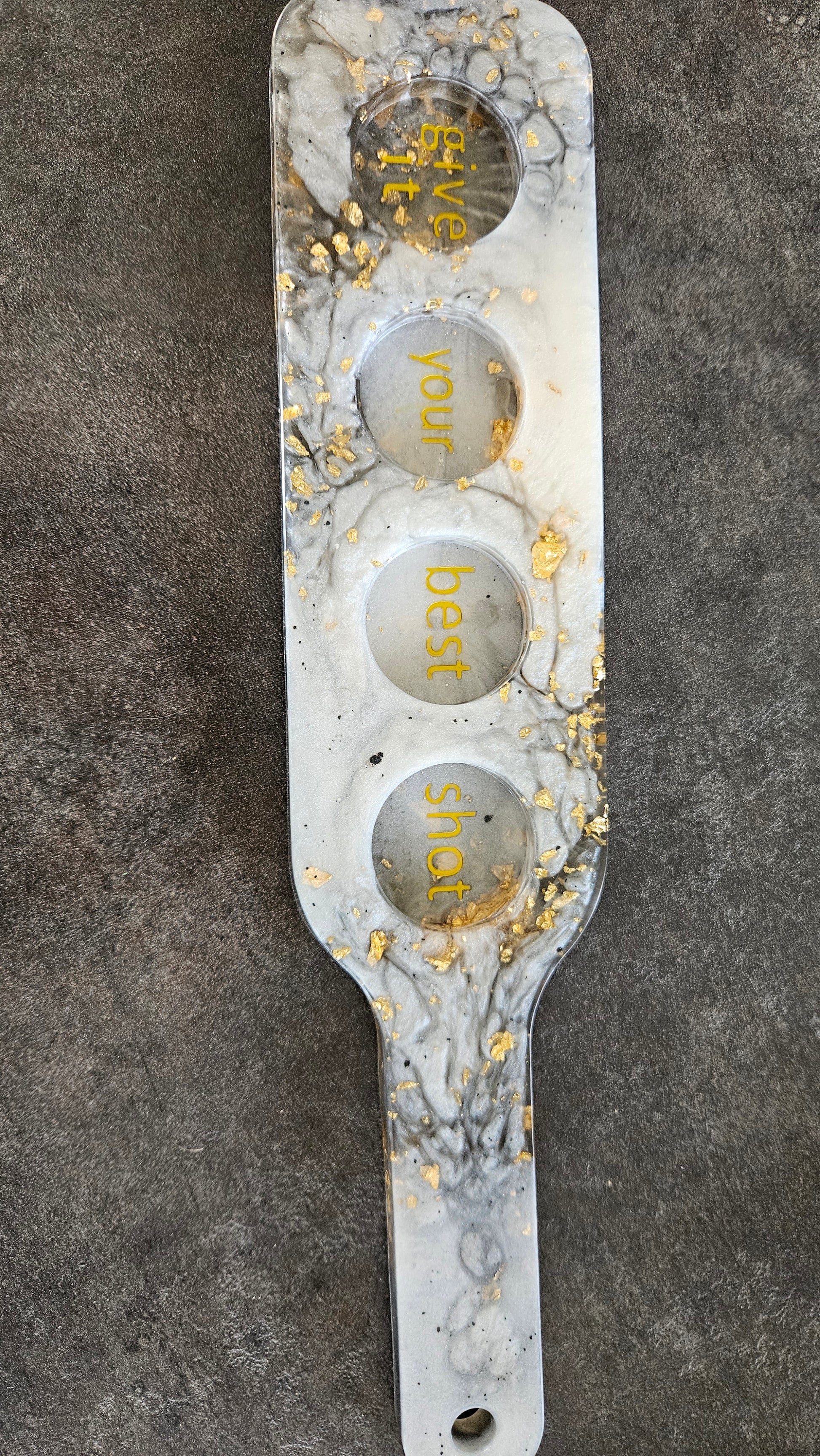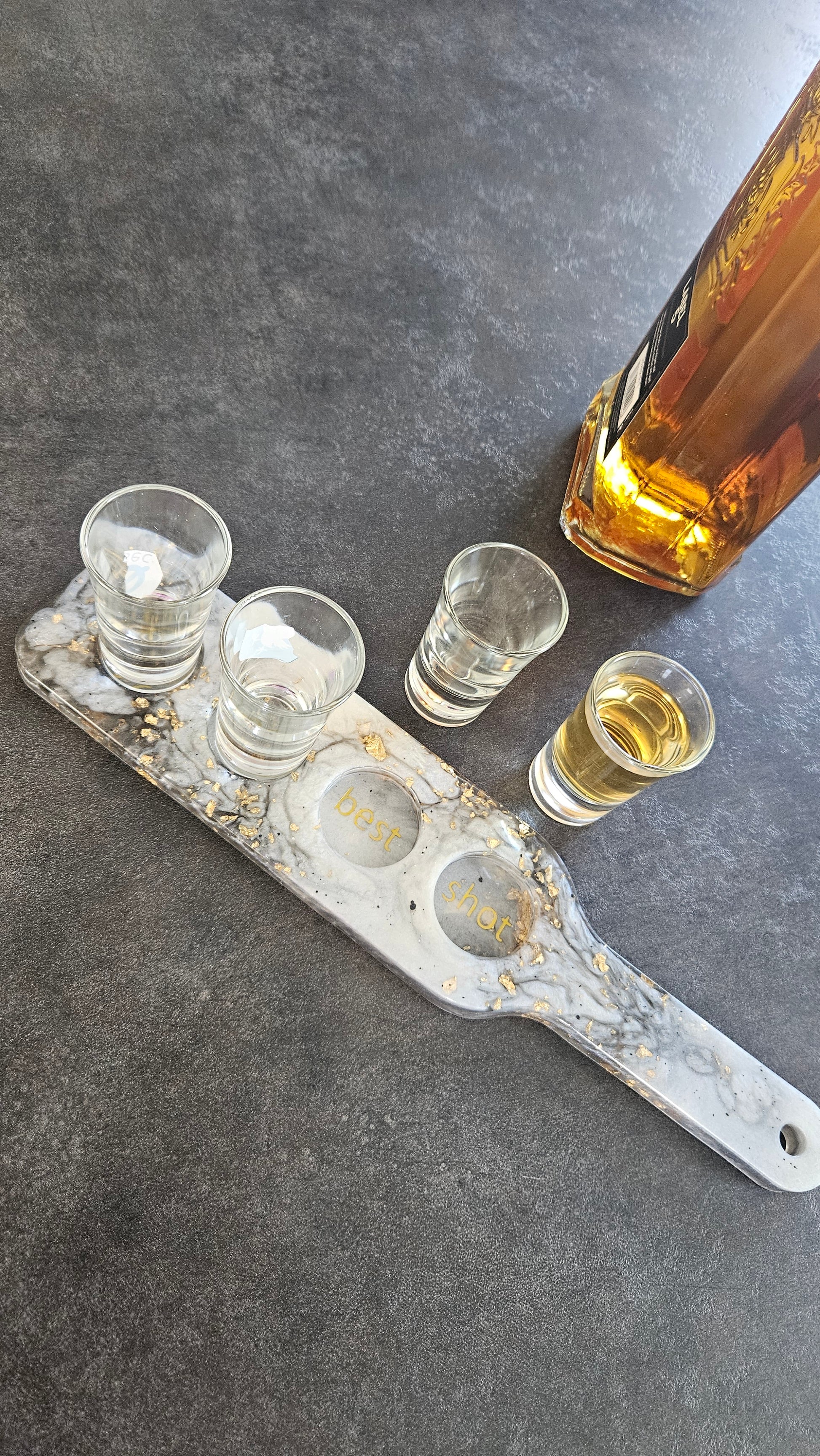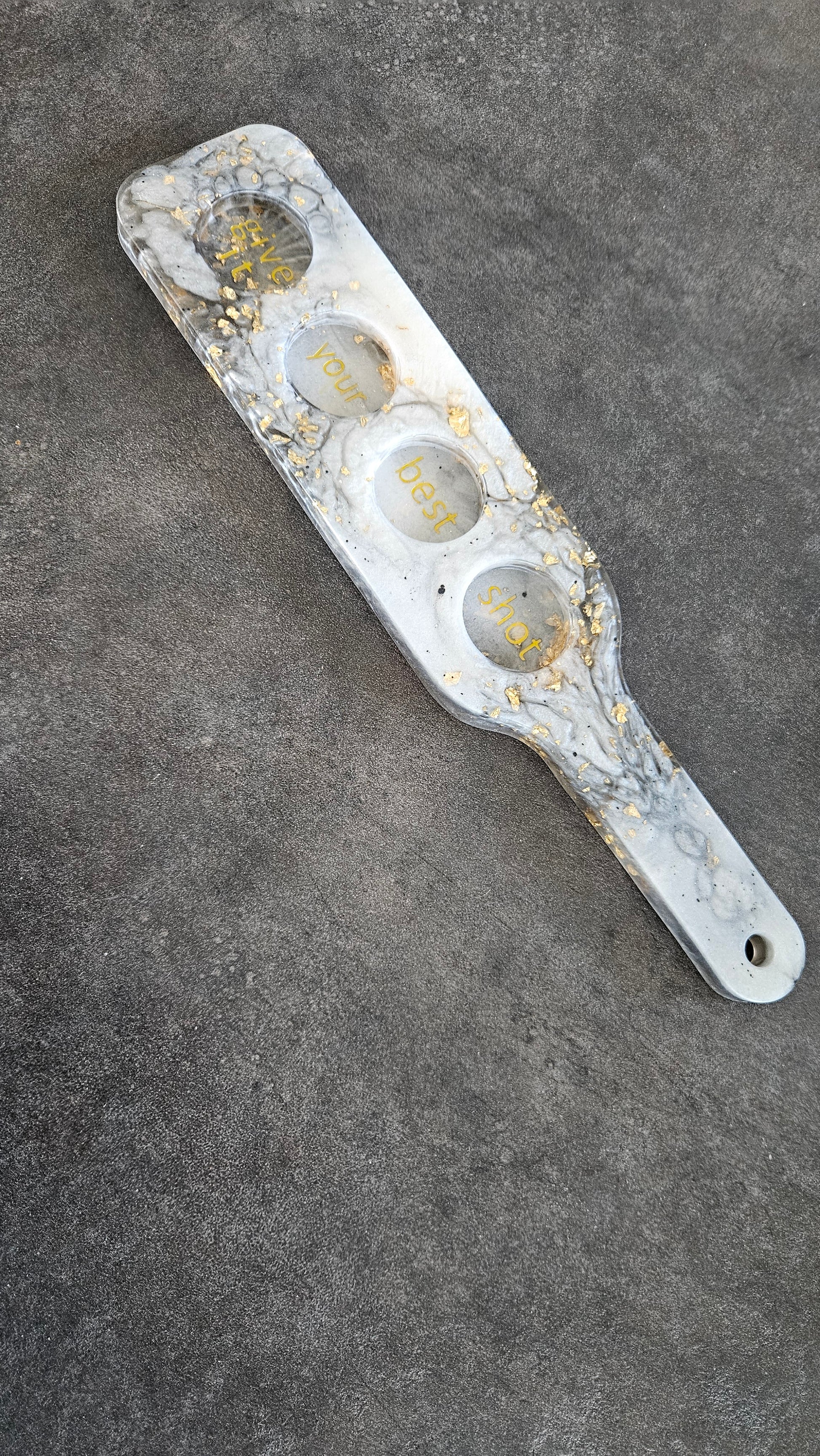 Planche de shooter effet marbré blanc gris avec des feuilles d'or.