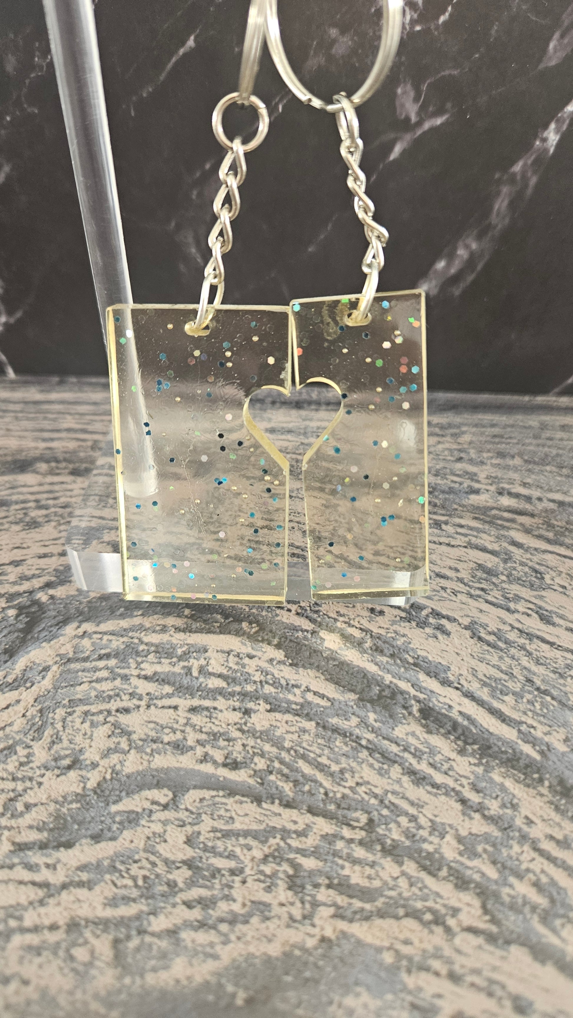 Porte clé rectangle avec un cœur avec des petites paillettes.