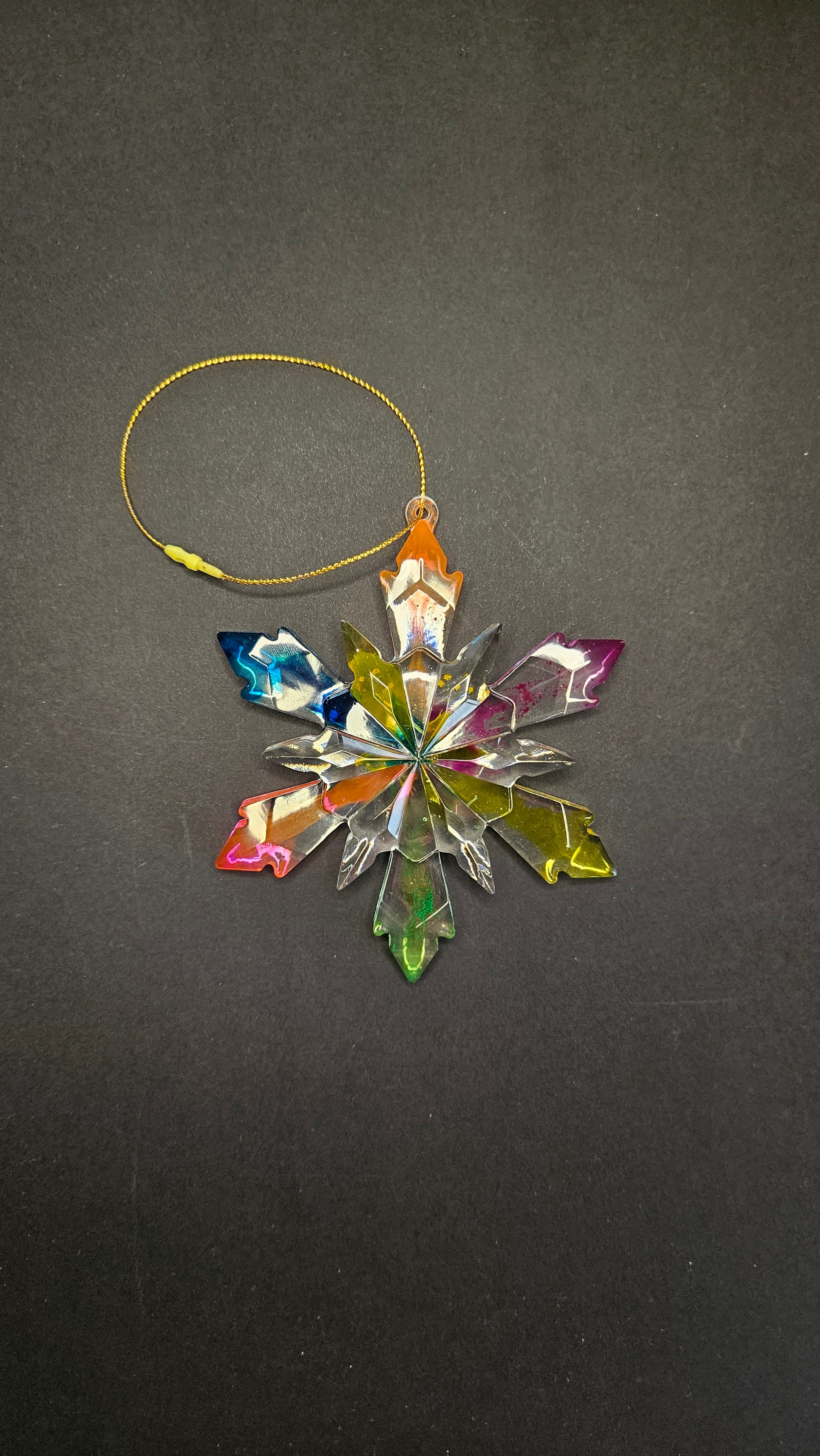 Flocon transparent avec des touche de bleu, vert, violet, jaune, rose et orange.