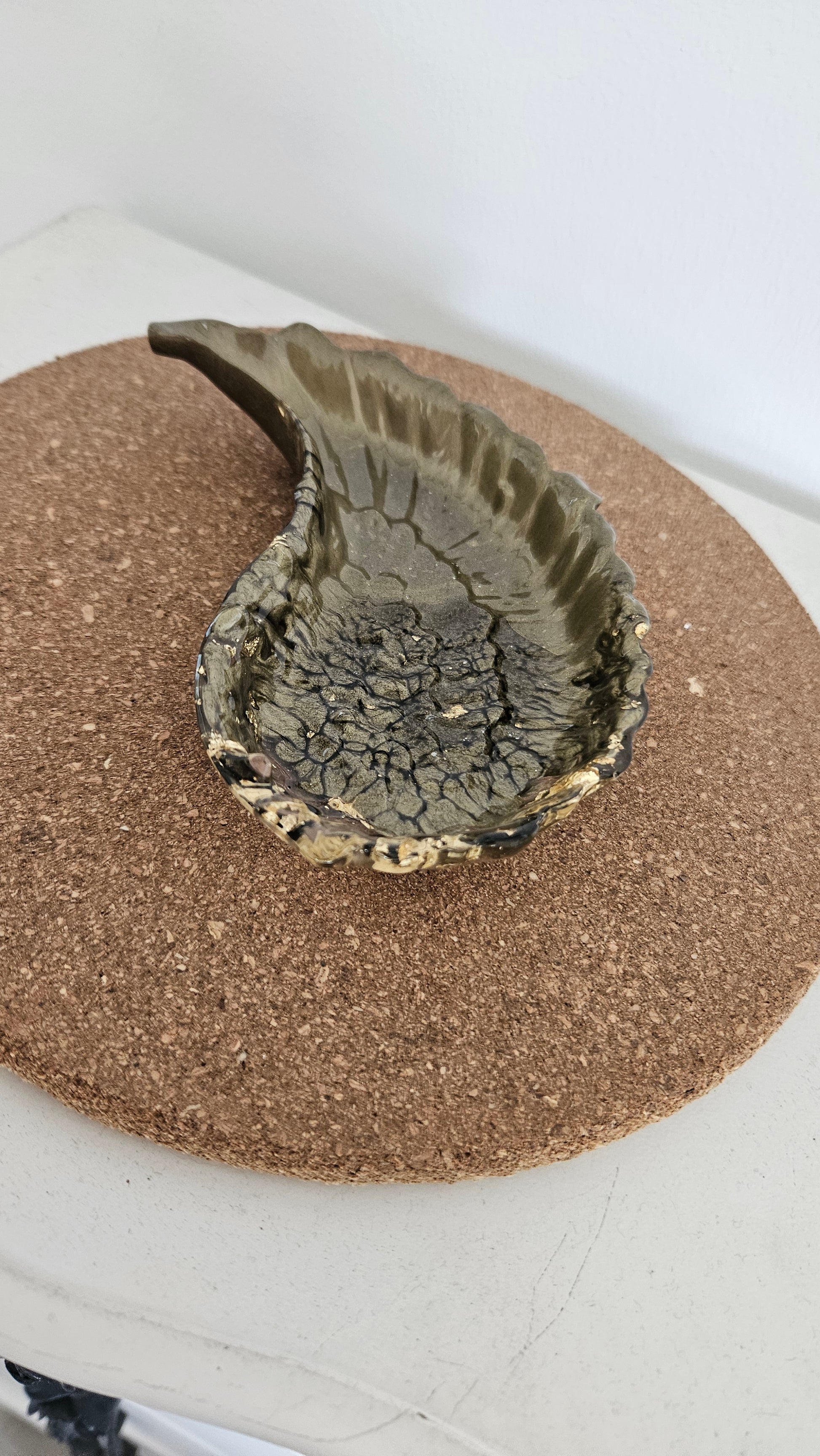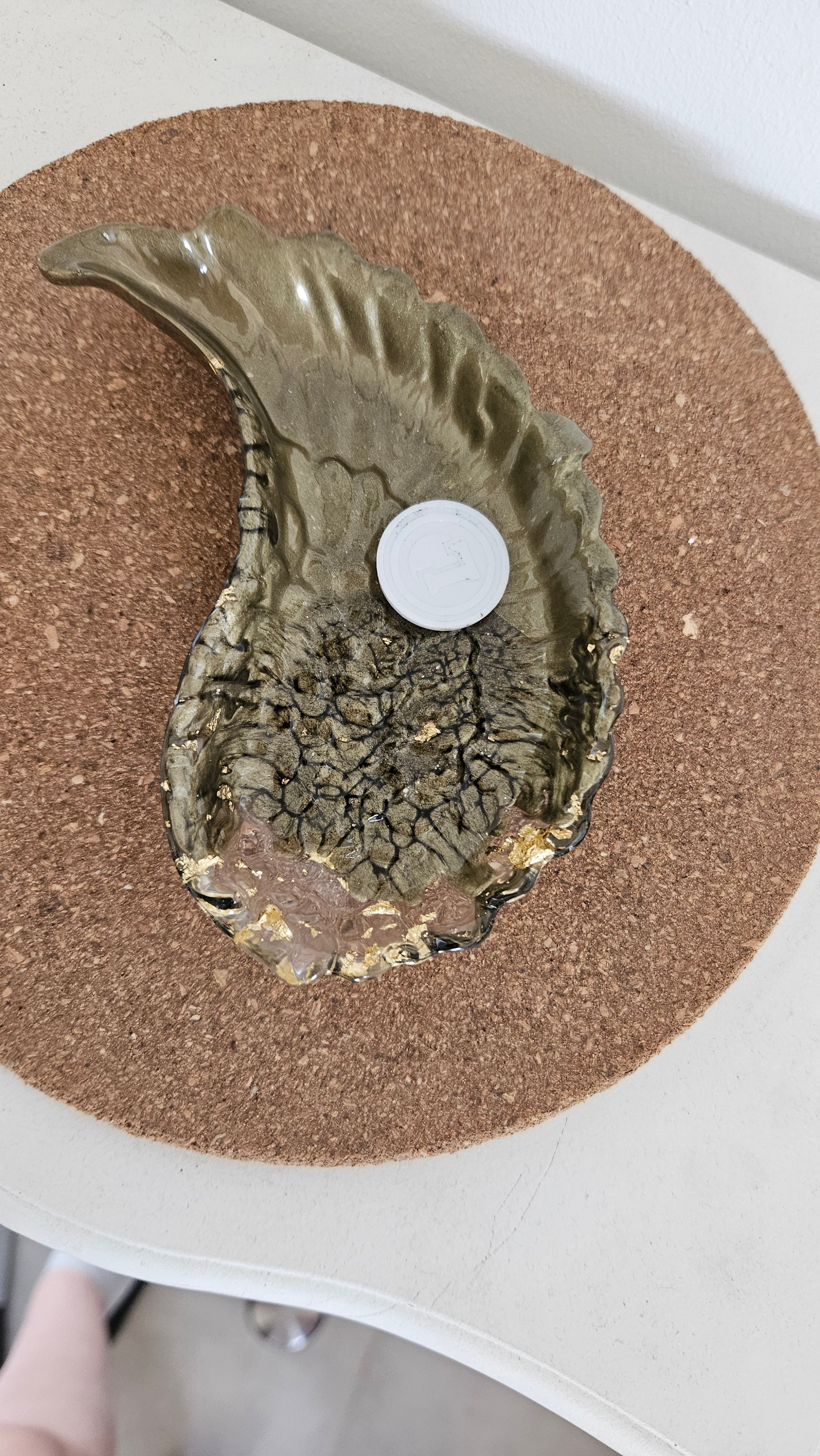 Vide poche en forme d'aile d'ange marron avec des feuille d'or.